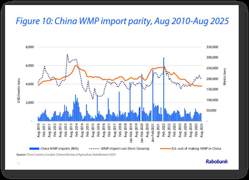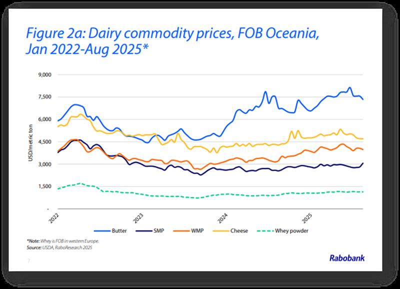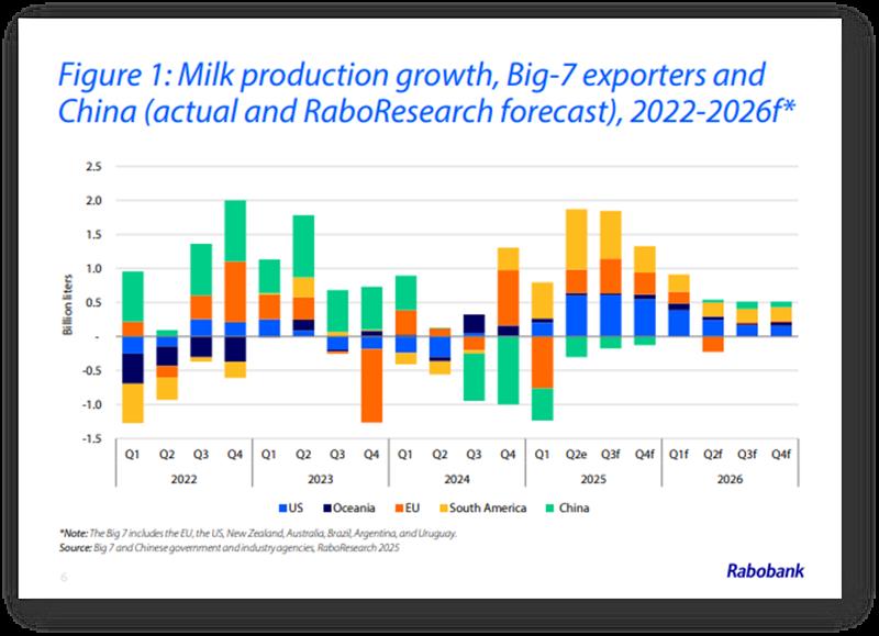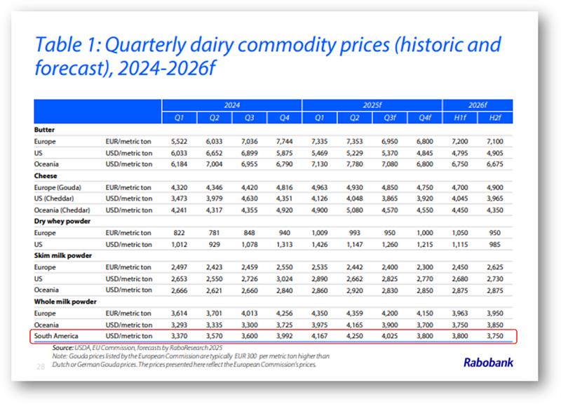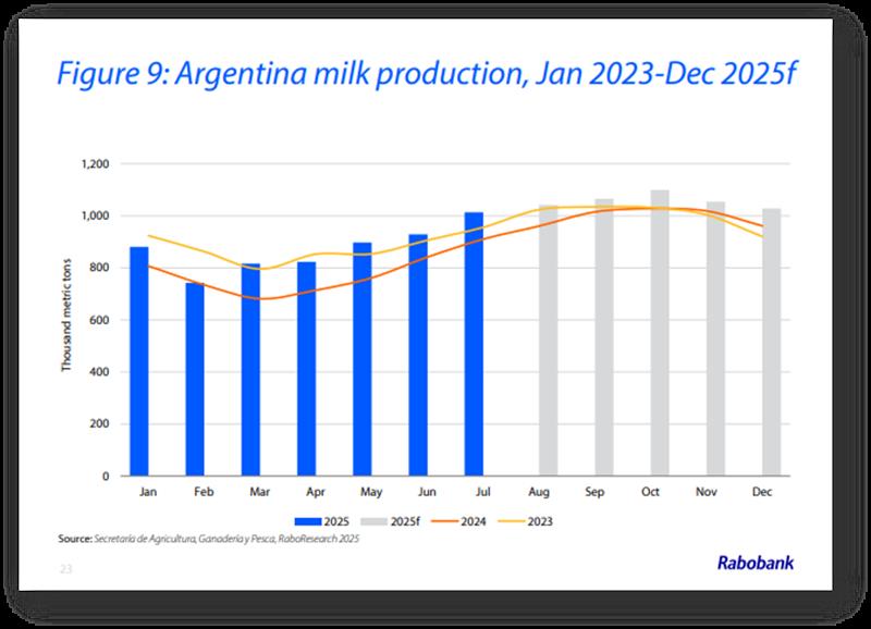 RABOBANK: Informe Lácteo Global 3° trimestre de 2025 9/9/2025![]() El crecimiento del suministro de leche va en aumento Resumen Los mercados mundiales de productos lácteos se han mantenido relativamente estables hasta el tercer trimestre de 2025. En Oceanía, los precios al contado de la leche en polvo (en USD) se han mantenido ligeramente más firmes desde el inicio del trimestre, con un aumento del 11 % para la leche en polvo descremada en polvo (LPD) y del 2 % para la leche en polvo entera (LPE). En cambio, los precios de la manteca han bajado un 3 %, mientras que los del queso cheddar han bajado un 5 % en comparación con el segundo trimestre de 2025. Los fundamentos mundiales se mantienen sólidamente equilibrados durante este período y los precios al contado actuales se mantienen muy por encima de los promedios de cinco años para la manteca (+29 %) y la LPE (+11 %), mientras que la LPD (-1 %) y el queso (+1 %) se mantienen más alineados con sus promedios a medio plazo. De cara al segundo semestre de 2025 y al primer semestre de 2026, se espera que un sutil cambio en los fundamentos de la oferta ponga a prueba el equilibrio del mercado. La velocidad de crecimiento de la oferta de leche en la mayoría de las principales regiones exportadoras de lácteos ha cambiado, superando las expectativas previas de RaboResearch. Por ejemplo, la producción de leche en julio en EE. UU. registró su mayor tasa de crecimiento (+3,4 % interanual) desde 2021, y Nueva Zelanda ha experimentado un inicio récord de su nueva temporada (aunque en la parte de baja producción). Se espera que el crecimiento de la oferta de leche mantenga su impulso hasta 2026, aunque a un ritmo moderado. En el segundo semestre de 2025, se espera que el crecimiento de la oferta de leche en las 7 grandes regiones exportadoras aumente un 2 % interanual antes de desacelerarse al 0,44 % interanual en el año fiscal 2026. La mejora de los márgenes de las explotaciones, la recuperación de los brotes de enfermedades del año pasado y la ausencia de condiciones climáticas adversas impulsarán el aumento de la oferta de leche en los próximos meses. La mayoría de los precios de la leche al productor en Europa y Oceanía se encuentran cerca de máximos históricos. Al mismo tiempo, se espera que los precios de los alimentos comprados sean favorables hasta 2026, ya que la abundancia de suministros mantiene los precios bajo control. De cara al futuro, los mercados mundiales de productos lácteos aún enfrentan dificultades en la demanda, especialmente entre los consumidores de ingresos bajos y medios. La continua debilidad de la demanda es evidente en muchos canales de servicios de alimentación, y se necesitará un impulso a la confianza del consumidor para impulsar el gasto discrecional. China aún lucha contra una caída del consumo, y las señales de recuperación en el Sudeste Asiático son dispares. En EE. UU., la preocupación por el mercado laboral y el impacto de los aranceles contribuye a la debilidad de la confianza del consumidor. Se han logrado avances en el ámbito comercial desde el último informe, pero la situación se mantiene dinámica. Se han cerrado varios acuerdos comerciales, pero su impacto en el comercio de productos lácteos sigue siendo incierto. El mercado mundial de productos lácteos se enfrentará a un período de creciente excedente exportable hasta el primer trimestre de 2026. Una mejora gradual de la demanda debería ser suficiente para contrarrestar el volumen sin saturar el mercado, pero con cierta presión a la baja sobre los precios a corto plazo. ![]() Mercados Lácteos Regionales Estados Unidos: La producción de leche está cobrando impulso, con un crecimiento que se sitúa en su nivel más alto desde el segundo trimestre de 2021. Se espera que este dinamismo se mantenga en 2026. Unión Europea: Se prevé que la producción de leche crezca un 0,3 % en 2025 (+0,6 % incluyendo el Reino Unido), gracias a buenos márgenes. La lengua azul es menos frecuente que el año pasado. China: La producción de leche continúa contrayéndose. Sin embargo, China aún lidia con un consumo menor al previsto, lo que genera volúmenes adicionales de leche para la industria. Nueva Zelanda: Con un fuerte flujo de caja y un sol radiante, es posible que se produzca una fuerte cosecha de leche primaveral en 2025/26. Australia: La producción de leche australiana seguirá bajo presión en 2025/26 debido a la escasez de alimentos en las regiones afectadas por la sequía y a un rodeo lechero reducido a medida que comienza la nueva temporada. Sudamérica: La producción de leche ha experimentado un sólido crecimiento en toda la región. Si bien el clima se mantiene favorable, los márgenes de ganancia de las explotaciones se están ajustando. Enfoque Global Los precios firmes de los productos lácteos han impulsado los precios en origen en Nueva Zelanda y Europa, con aumentos interanuales del 27% y el 18%, respectivamente. El buen abastecimiento de los mercados mundiales de alimentos concentrados ha mantenido los precios a raya. En general, los buenos márgenes en origen están impulsando el aumento de la producción de leche, liderada por Estados Unidos y Nueva Zelanda. La producción de leche en las 7 Grandes regiones exportadoras alcanzará su punto máximo en el segundo semestre de 2025, y el crecimiento continuará en 2026, aunque a un ritmo más moderado. En términos anualizados, se prevé que la oferta de leche en las 7 Grandes aumente un 1,6% en 2025 y un 0,44% en 2026, lo que resultará en un crecimiento combinado de 7,1 millones de toneladas métricas en ambos años. La desaceleración del crecimiento de la producción de leche en 2026 se debe principalmente a las sólidas cifras comparables interanuales. En Estados Unidos, la producción de leche está cobrando impulso gracias a la expansión del rodeo. En Sudamérica, la recolección de leche es sólida en comparación con las débiles cifras comparab