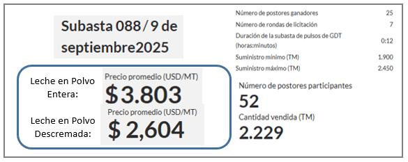 La subasta Nº 088 se ha llevado ha cabo en el día de hoy, martes 9 de septiembre, donde el precio promedio obtenido para la LPE ha sido de 3.803 US$/t, el cual representa una baja de 4,7% respecto a lo publicado en la última GDT pulse (3.992 US$/t) y de 0,2% respecto al último evento del GDT (3.809 US$/t).