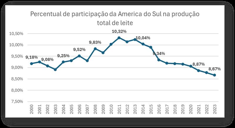 Después de alcanzar el 10,3% de la producción mundial de leche de vaca en 2011, América del Sur perdió gradualmente su participación, hasta llegar al 8,67% en 2023, según la FAO.