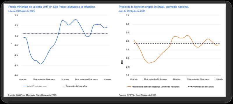 BRASIL: Lácteos 3° trimestre de 2025 11/9/2025![]() La fortaleza de la oferta debería disminuir en el cuarto trimestre Los altos precios internos y la apreciación del real brasileño han mantenido un elevado volumen de importación de productos lácteos. Entre los principales productos importados se encuentran la leche entera en polvo, el queso y la leche descremada en polvo, provenientes principalmente de los socios del Mercosur. Esto ha dado lugar a una perspectiva más optimista en comparación con el informe anterior, y la mayoría de las empresas anticipan un crecimiento estable a moderado en las ventas de productos lácteos durante el segundo semestre de 2025. Las expectativas de una demanda ligeramente más fuerte también pueden ayudar a moderar la caída de los precios de la leche a fines del tercer trimestre y principios del cuarto trimestre, cuando la producción estacional generalmente aumenta y ejerce presión a la baja sobre los precios en origen. Aunque los desequilibrios fiscales siguen siendo una preocupación, las tasas de interés más altas han ayudado a anclar las expectativas de inflación y fortalecer el real brasileño, que se ha apreciado un 12% frente al dólar estadounidense desde enero. Brasil registró una sólida producción de leche en el primer semestre de 2025. La producción cobró impulso en el segundo trimestre de 2025, creciendo a una tasa anualizada del 9,3 %, el ritmo más rápido en más de una década. Las condiciones climáticas favorables y la mejora de los márgenes de beneficio para los agricultores, impulsadas por la bajada de los precios de la harina de soja y el maíz, contribuyeron al aumento de la producción. Los grandes productores (con más de 1.000 vacas) han incrementado considerablemente sus inversiones y están creciendo a tasas de dos dígitos, lo que contribuye a la aceleración del crecimiento general. La economía brasileña muestra resiliencia a pesar de un crecimiento más lento. Según la última encuesta del BCB, publicada el 25 de agosto, los economistas pronostican un crecimiento del PIB del 2,18 % para 2025, inferior al 3,4 % de 2024, pero superior a lo esperado dadas las condiciones monetarias restrictivas. Mientras tanto, las expectativas de inflación se han moderado al 4,86 %, frente al 5,68 % de marzo. Un mercado laboral firme y una demanda de consumo constante respaldan las perspectivas. El desempleo se mantiene históricamente bajo, por debajo del 7%. Si bien el crecimiento del ingreso real se ha desacelerado, la compra de alimentos no ha experimentado una disminución significativa. Los precios de la leche experimentaron una moderada disminución ante el aumento de la oferta. Los precios comenzaron a disminuir en el tercer trimestre de 2025, a medida que la oferta aumentó en los principales estados productores. Según CEPEA, el precio promedio de la leche en origen en julio fue de BRL 2,65/litro (USD 0,549/litro), inferior a los BRL 2,82/litro de abril (USD 0,552/litro), ajustado a la inflación. A pesar de la tendencia a la baja, los precios se mantienen relativamente respaldados por una demanda mayor de lo esperado. De enero a julio de 2025, los volúmenes de importación disminuyeron un 6% interanual. Las exportaciones cayeron un 6% en el mismo período. Si la oferta continúa creciendo por encima de las expectativas, los precios de la leche en origen podrían disminuir más de lo previsto en el cuarto trimestre. La dinámica comercial es mixta, con importaciones elevadas y exportaciones rezagadas. RaboResearch ha revisado su pronóstico de producción de leche en Brasil para 2025 a un crecimiento del 6,5 %. Datos preliminares del Instituto Brasileño de Geografía y Estadística (IGBE) muestran que la producción de leche brasileña aumentó un 6,8 % en el primer semestre de 2025. Se espera que el crecimiento se modere ligeramente en el segundo semestre de 2025, con un aumento anualizado del 6,2 %, lo que refleja un alto efecto base del segundo trimestre y datos comparables interanuales más débiles. Se avecinan precios más bajos de los productos lácteos con una oferta abundante y una demanda en desaceleración ![]() traducido por el OCLA del Informe de Agronegocios de Rabobank
