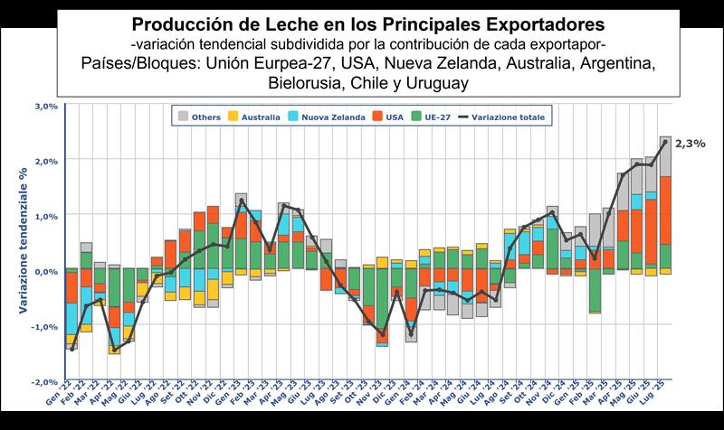 2025 promete ser un año extraordinario, tanto en términos de clima como de producción. El comienzo del verano, con un junio muy caluroso, limitó inicialmente el crecimiento de la producción, que luego se disparó entre julio y agosto, con picos de hasta el 10 %, no solo en Italia. Este aumento se debe a las mejoras en las tecnologías de refrigeración, los robots de ordeño, los precios favorables de la leche, el aumento de novillas y la disminución de los casos de lengua azul, que aparecieron con una rapidez sin precedentes.