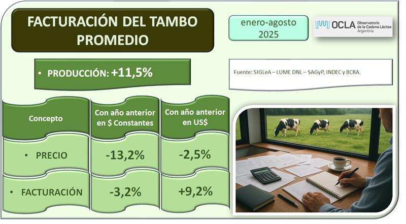 El tambo promedio SIGLeA-LUME que en agosto de 2025 tuvo una producción diaria de 3.363 litros, facturó un 6,0% por debajo del año anterior. En el acumulado del período enero-septiembre, medido en moneda constante facturó un 3,2% por debajo de igual período del año anterior debido a una baja en el precio de 13,2% pero con una mejora de producción del 11,5%. En dólares en ese período la facturación fue 9,2% superior a igual período del año anterior.