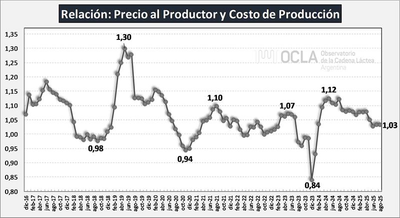 El gráfico siguiente muestra la relación entre el precio percibido y el costo de producción, que cuando el factor supera 1 el precio es superior al costo. Esta relación es positiva en los últimos 19 meses, llegó 1,12 en mayo 2024 y en los últimos meses se mantenía en 1,08, cayendo a 1,03 en junio, julio y agosto, marcando desde el pico mencionado una tendencia al decrecimiento y muy cerca de la relación de equilibrio.