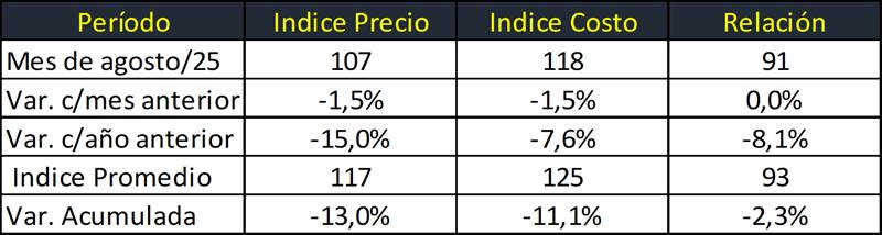 Relación Indice Precio e Indice Costo de Producción: agosto 2025 23/9/2025