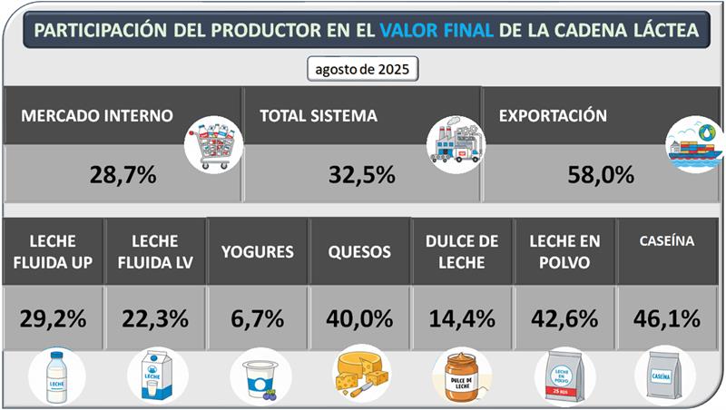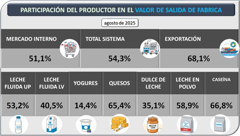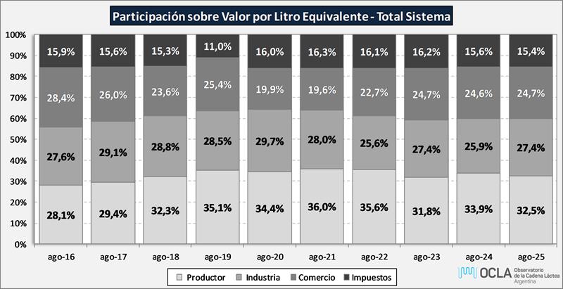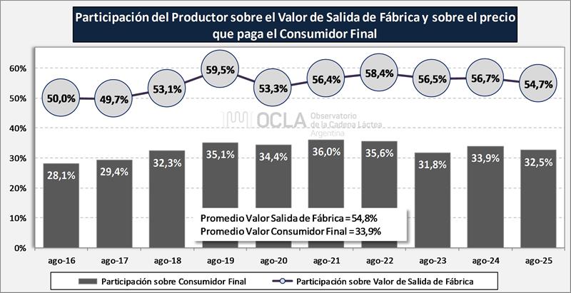 La participación del productor en el total del sistema fue para agosto de 2025 del 32,5%, 0,3 puntos por debajo del mes anterior, 1,4 ´puntos por debajo del año pasado y 0,2 puntos por encima de la media del 32,3%. Los valores finales de mercado interno cayeron 0,2 y los de mercado externo bajaron 0,6 puntos porcentuales, respecto al mes anterior. En el interanual casi se mantiene en el mercado interno y baja 10,4 puntos en el externo. La participación del productor sobre el valor de salida de fábrica (precio al que vende la industria) fue de 54,3%, 0,4 puntos por debajo del mes anterior, 2,3 puntos por debajo del año anterior y 0,3 puntos por arriba del promedio de la serie (54,0%).