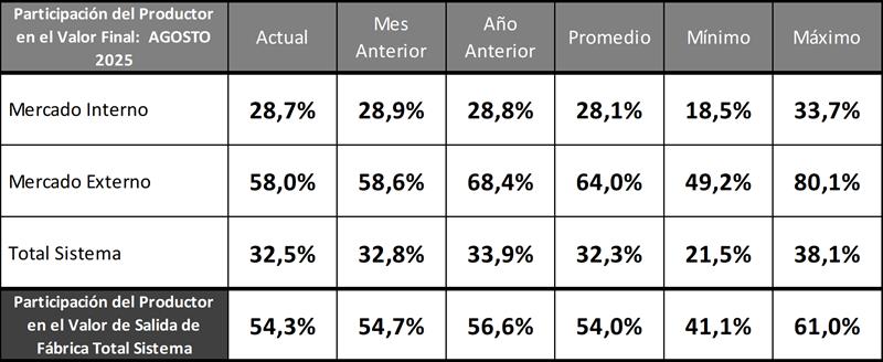 En agosto 2025 la participación del productor en ambos mercados y por ende en el total, se deterioró respecto al mes anterior y a igual mes del año anterior. La industria por su parte mantuvo en general su participación en el mercado interno y mejora el frente externo, lo cual le permite una mejora en el valor general del sistema.