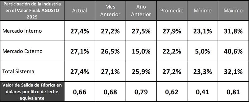 La industria mejoró 0,3 puntos porcentuales en agosto de 2025 su performance de participación en el total del sistema (27,4%), mejorando levemente la participación en el mercado interno (+0,2) y 0,6 puntos en el mercado externo, todas respecto al mes anterior. La facturación total de salida de fábrica por litro de leche equivalente estuvo en US$ 0,66 (0,02 menos que el mes anterior) y US$ 0,13 menos que igual mes del año anterior, +US$ 0,04 que el promedio de la serie disponible y a 15 centavos del máximo logrado en mayo y octubre de 2013 (US$ 0,81).