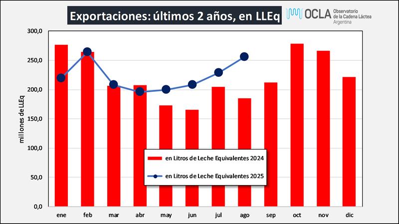 En litros de leche equivalentes a agosto de 2025, fueron superiores (+5,6%) en el interanual y representaron el 24,7% de la producción total (en ene-ago de 2024 representaron el 25,9%).