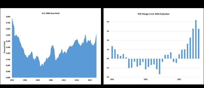 La industria láctea estadounidense está produciendo leche a raudales. La producción de leche alcanzó los 19.520 millones de libras en agosto (unos 8.600 millones de litros de leche), un 3,2% más que hace un año. El USDA revisó significativamente al alza su estimación de la producción lechera y el número de vacas de julio. La agencia informa ahora que los productores lácteos incorporaron 35.000 vacas en julio y otras 10.000 cabezas en agosto. Esto elevó el rodeo de vacas lecheras de agosto a 9,52 millones de cabezas, la cifra más alta desde finales de 1993 y 176.000 cabezas más que hace un año.