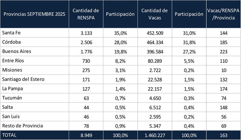 En el cuadro superior se puede visualizar la distribución de tambos y vacas por provincia, al igual que la participación relativa y la cantidad de vacas por unidad productiva. El 91% de los tambos y el 95,5% de las vacas en producción se concentran en la Cuenca Central (Santa Fe, Córdoba, Buenos Aires y Entre Ríos). También podemos ver un crecimiento importante de la cantidad de vacas por tambo que asciende a 163 cabeza en septiembre próximo pasado, cifra que creció un 6,2% respecto al promedio de los 10 años anteriores.
