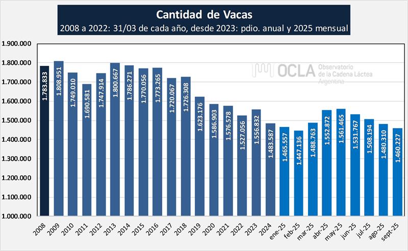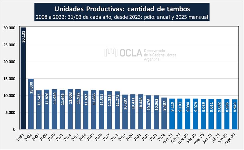El año 2025 inició con 9.129 unidades productivas de las cuales en septiembre se registran 8.949, ello implica 180 tambos menos que si lo extrapolamos al año significaría un 2,60% menos, tasa levemente superior a la observada en los últimos 10 años (-2,4% promedio anual).