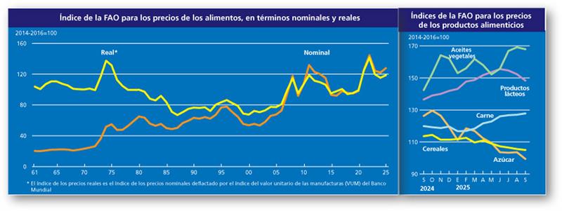 De la serie disponible de 429 meses (1990-2025) del Índice de FAO 28 meses (6,5%), estuvieron por encima del índice del mes pasado.