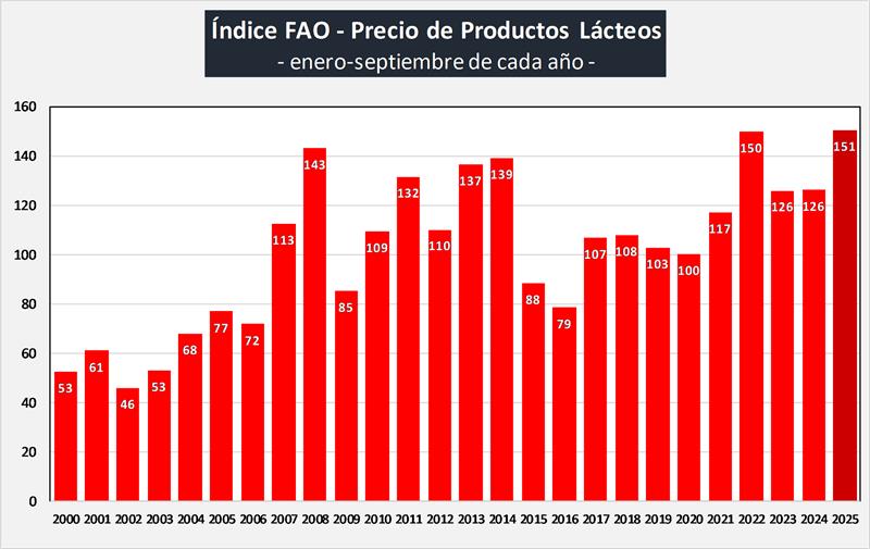 Por su parte el gráfico siguiente muestra el valor promedio de cada año del índice de precios de los lácteos de FAO de los últimos 26 años (2000-2025):