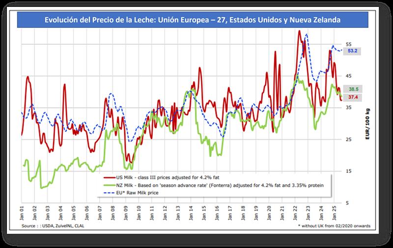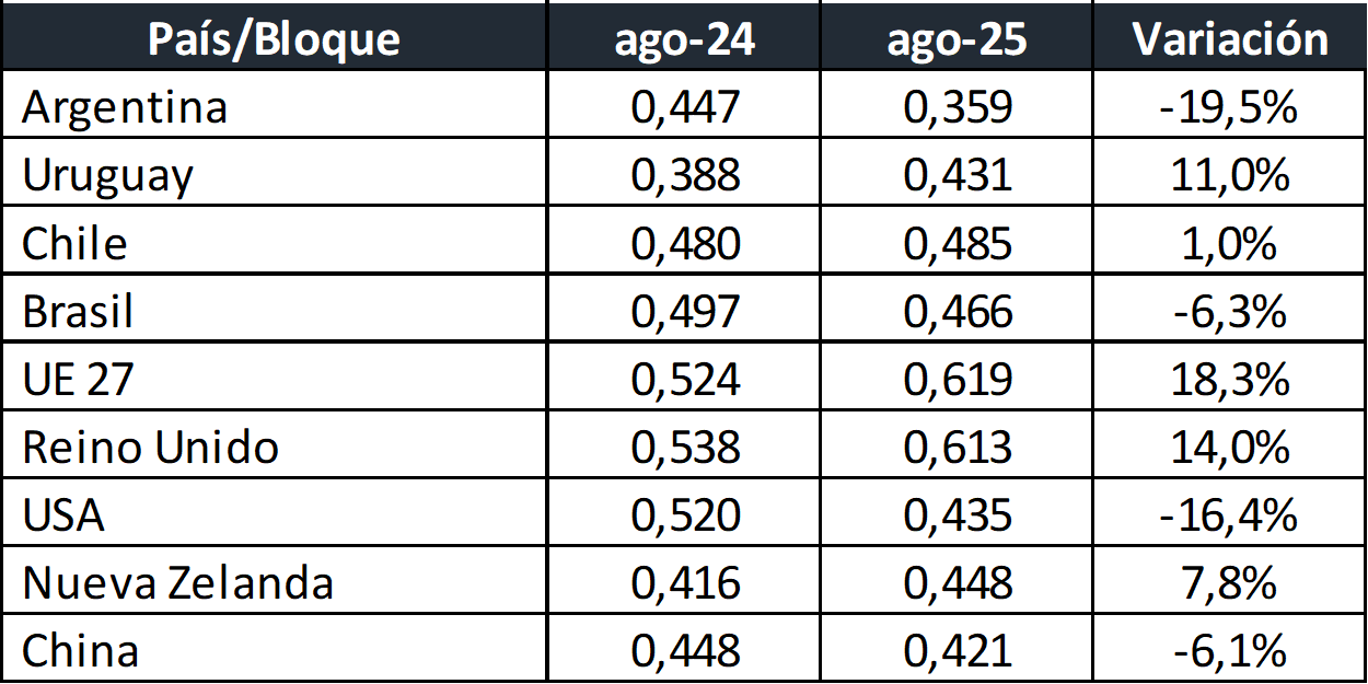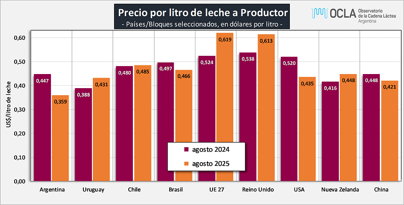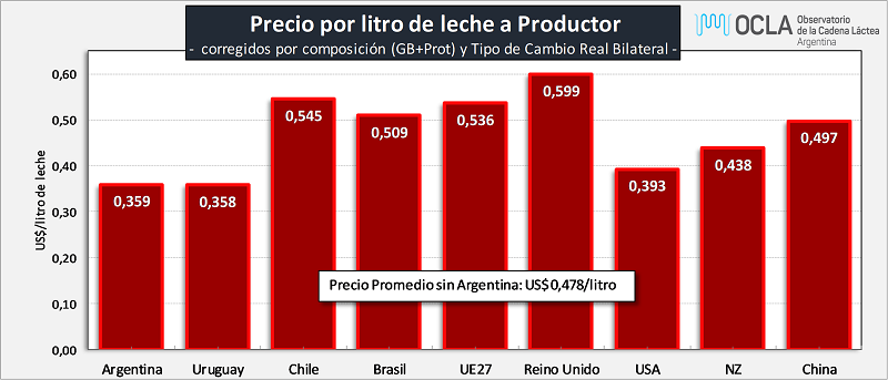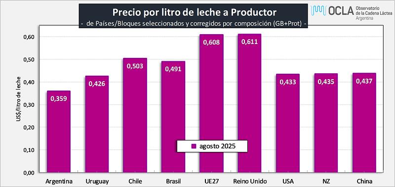 Precios de Leche Cruda en los principales Países/Bloques 10/10/2025Precio de la Leche al Productor en dólares por litro: ![]() Fuentes: DNL-MAGyP, INALE, ODEPA, CEPEA/ESALQ USP, EMMO, AHDB, USDA y CLAL, respectivamente. Precios en Reales, Euros y NZ$, convertidos a dólares al cambio oficial, al igual que los precios cada 100 libras de USA, divididos por 45,359. No es correcta la comparación de leche tal cual ya que comparamos “productos diferentes”. A pesar de no contar con todos los atributos de calidad composicional e higiénico sanitarios a que hacen referencia estos diferentes precios, realizamos al menos las correcciones por composición. Ejemplo: el precio de la leche de Argentina es para una composición de 7,37% de Sólidos Útiles (3,88% de GB + 3,49% de Proteína), el precio de Nueva Zelanda es para una leche estándar de 7,60% de Sólidos Útiles (4,20% de GB + 3,40% de Proteína). La serie de precios de Argentina compara el precio en $ de Panel 18 con el dólar Mayorista BCRA Referencia de Comunicación “A” 3500. ![]() Precio de la Leche al Productor en dólares por litro, corregidos por Sólidos Útiles (Grasa Butirosa + Proteína): ![]() Precio de la Leche al Productor en dólares por litro, corregidos por Sólidos Útiles (Grasa Butirosa + Proteína): ![]() En este último gráfico se presentan los precios del segundo gráfico (corregidos por sólidos útiles) y se los ajusta con el Índice de Tipo de Cambio Real Bilateral que Argentina tiene con cada uno de esos países/bloque. Índice de Tipo de Cambio Real Multilateral (ITCRM) y Bilaterales Este índice mide el precio relativo de los bienes y servicios de la economía argentina con respecto al de los principales 12 socios comerciales del país, en función del flujo de comercio de manufacturas. Se obtiene a partir de un promedio ponderado de los tipos de cambio reales bilaterales de los principales socios comerciales del país. Se considera la evolución de los precios de las canastas de consumo representativas de los socios comerciales expresados en moneda local en relación con el valor de la canasta de consumo local, constituyéndose como una de las medidas amplias de competitividad (de tipo precio). El ITCRM se elabora y publica de forma diaria, a partir de las cotizaciones de las monedas a las 15 hs. de cada día y contempla un mecanismo de diarización de las estimaciones y de replicación de los últimos datos de los índices de precios representativos para Información aún no conocida. Precios European Milk Market Observatory ![]() elaborado por el OCLA con información de diferentes fuentes