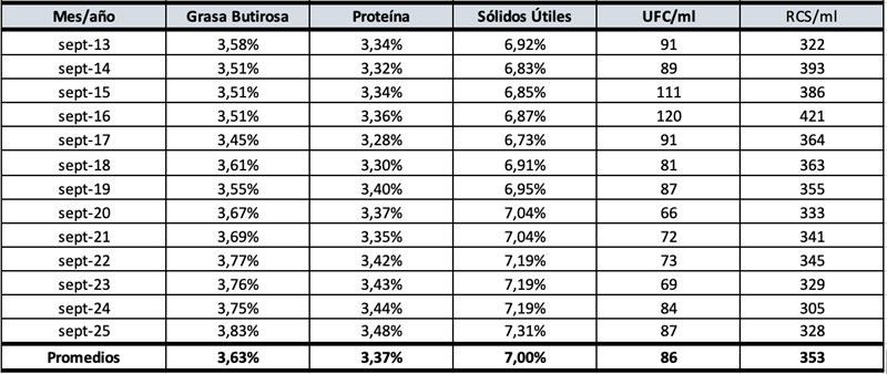 Evolución de la Calidad de Leche: mes de septiembre últimos 13 años