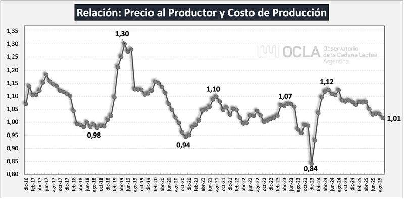 El gráfico siguiente muestra la relación entre el precio percibido y el costo de producción, que cuando el factor supera 1 el precio es superior al costo. Esta relación es positiva en los últimos 20 meses, llegó 1,12 en mayo 2024 y en los últimos meses se mantenía en 1,08, cayendo a 1,03 en junio, julio y agosto, y en septiembre 1,01, marcando desde el pico mencionado una tendencia al decrecimiento y muy cerca de la relación de equilibrio.
