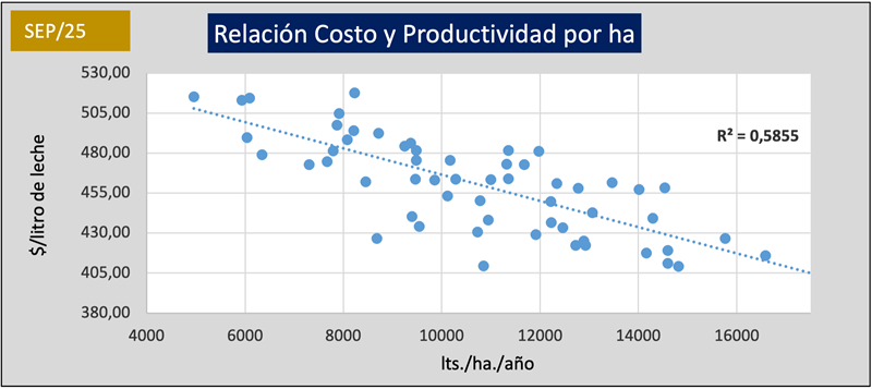 Por último, incorporamos el gráfico donde se obtiene la mayor correlación entre las variables económicas y productivas, en este caso la relación entre el Costo y la Productividad (medida en litros de leche por hectárea por año).