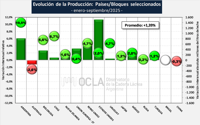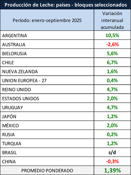 En el cuadro siguiente se toma un grupo seleccionado de los principales países que representan algo más del 55% de la producción mundial de leche de vaca, en el cual se puede observar una suba de la producción del 1,39%, para el período enero-septiembre del año 2025 respecto a igual período del año 2024.
