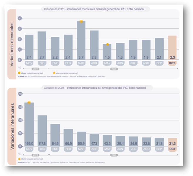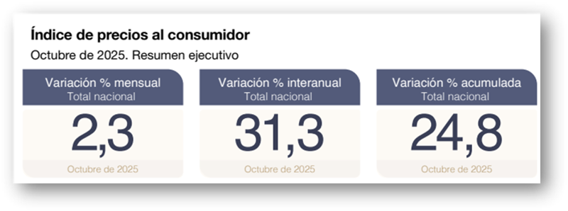 El nivel general del Índice de precios al consumidor (IPC) representativo del total de hogares del país registró en octubre una variación de 2,3% con relación al mes anterior, en el período enero- octubre del año acumuló una suba del 24,8% y la variación interanual fue del 31,3%.