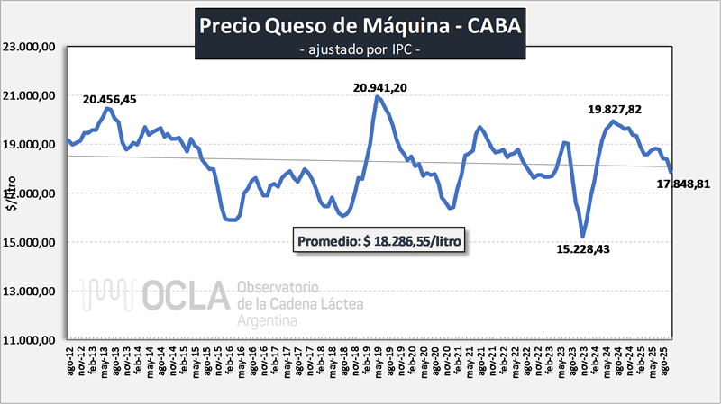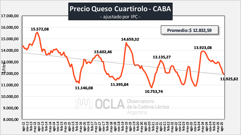 En los cuatro gráficos siguientes se toman como referencia productos básicos como la leche común entera de litro, el queso cuartirolo, el queso barra o de máquina y el yogur bebible de litro, en este caso de CABA por contar con una serie un poco más prolongada en el tiempo y se los actualiza por el índice de precios al consumidor. En la leche común entera de litro se observa que el precio de octubre del 2025 es 1,9% inferior al mes anterior en moneda corriente y un 17,1% menor al precio observado en igual mes del año anterior en moneda constante. Siguiendo en el análisis a moneda constante, el precio de octubre de 2025 se ubica 6,8% por debajo de la media de la serie y es 26,1% más bajo que el máximo alcanzado hasta ahora en marzo de 2024, y presenta la tendencia de estos últimos 14 años como estable, a pesar de una fuerte pendiente negativa en los últimos 19 meses.