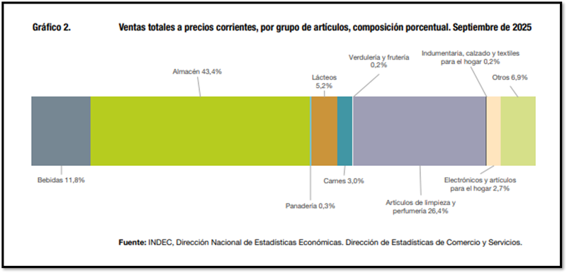 En septiembre de 2025 las ventas de lácteos en autoservicios mayoristas fueron de $ 14.946,3 millones sobre una venta total de $ 287.852,7 millones, lo que determina una participación del 5,2%.