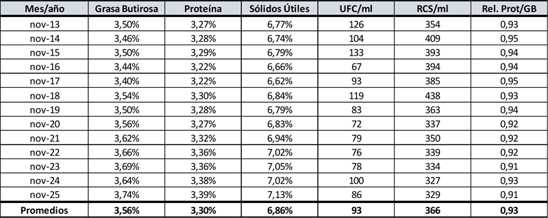 Evolución de la Calidad de Leche: mes de noviembre últimos 13 años