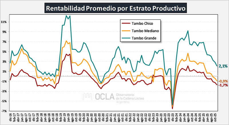 Cabe sí mencionar que, en el caso de los denominados tambos chicos, que tienen un promedio de producción diaria de 1.761 litros en los modelos de INTA, para noviembre arrojan una tasa de rentabilidad negativa del 1,7%, por lo que el costo de producción se encuentra por encima del precio percibido, los tambos del estrato medio perforan en octubre y noviembre el nivel cero rentabilidad (-0,9% en noviembre) y los tambos más grandes (8.830 litros por día) logran una tasa del 2,1% menos de la mitad de la tasa exigida de 5% al Capital Promedio Operado. Todos, (salvo un par de meses) con tendencia decreciente en las tasas de rentabilidad en los últimos 18 meses.