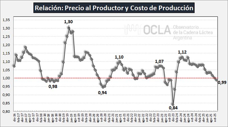 El gráfico siguiente muestra la relación entre el precio percibido y el costo de producción, que cuando el factor supera 1 el precio es superior al costo. Esta relación es positiva en el período febrero 2024 y octubre 2025, llegó 1,12 en mayo 2024 y en los últimos meses se mantenía en 1,08, cayendo a 1,03 en junio, julio y agosto, marcando desde el pico mencionado una tendencia al decrecimiento, tocando la relación de equilibrio en octubre próximo pasado y perforándola en noviembre último (0,99).