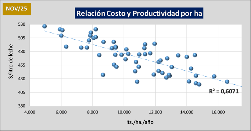 Por último, incorporamos el gráfico donde se obtiene la mayor correlación entre las variables económicas y productivas, en este caso la relación entre el Costo y la Productividad (medida en litros de leche por hectárea por año).