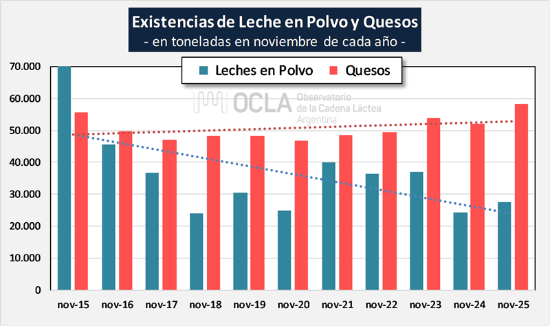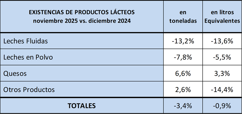 Las existencias fueron en noviembre pasado un -3,4% en volumen de producto y -0,9% en litros de leche equivalentes, respecto a las iniciales del año (01/01/25).