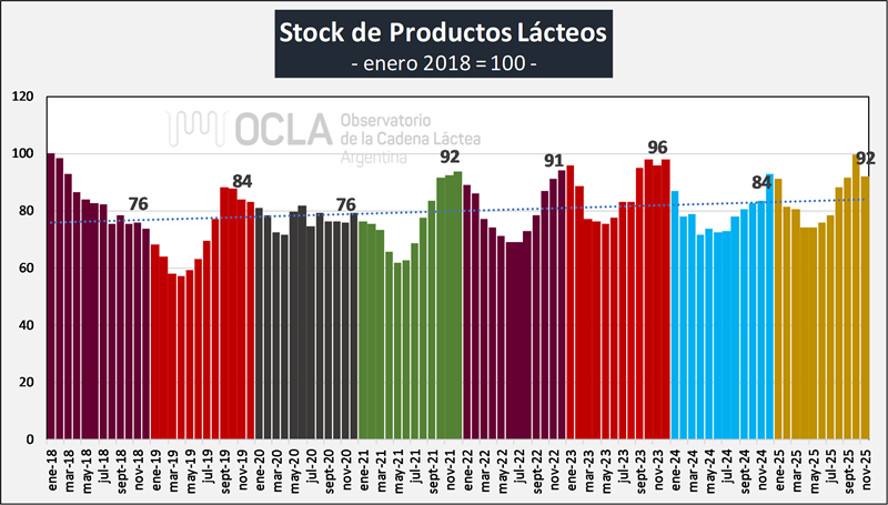 Las existencias en noviembre llegaron a 996 millones de litros de leche equivalentes y en la comparación interanual nov/25-nov/24, los stocks fueron un 6,4% superiores en volumen y 10,0% en LLEq.