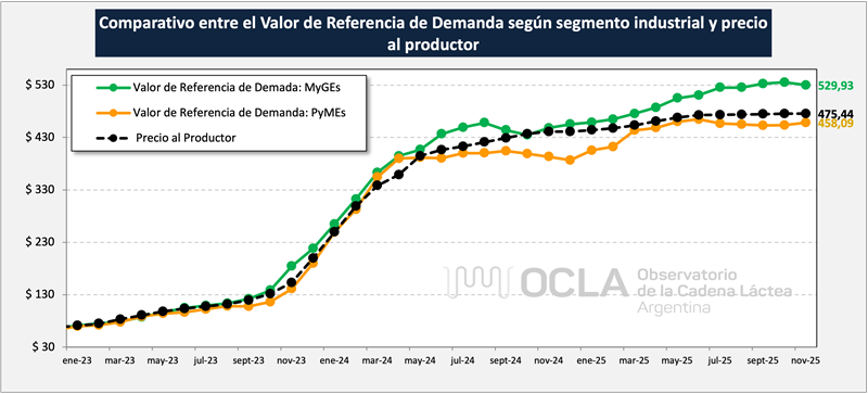 En el mes de noviembre de 2025 la capacidad de pago según IAPUCo llegó a $ 493,33/litro de leche (+0,1% respecto al mes anterior) y fue $ 17,89/litro, superior al precio real pagado que fue para ese mes de $ 475,44. No se incluyen Notas de Crédito, ni los pagos por fuera de la liquidación formal que también son precio y obviamente las estadísticas no pueden capturar. También se puede observar en el gráfico superior que el Valor de Referencia de Demanda o Costo de Largo Plazo del Productor estuvo en noviembre 2025 en $ 553,32 ($ 77,88 por encima del precio percibido) y que la brecha que se venía reduciendo en el primer cuatrimestre del año, se amplió en estos últimos meses.