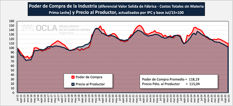 Viendo el precio real liquidado al productor y comparado con la capacidad de pago promedio de la industria, actualizada por IPC y llevado a base julio 2015 = 100, para un período más prolongado, puede observarse que en el largo plazo (salvo oscilaciones temporales) los valores promedio convergen: Indice 115,04 por litro de Precio al Productor e Indice 118,19 por litro de Poder de Compra, con un cierto distanciamiento en el período nov23-ago24 a favor de los poderes de compra, y equiparándose ambos índices entre sep24-feb25 y volviendo a ser superiores los poderes de compra en marzo-noviembre próximos pasados.