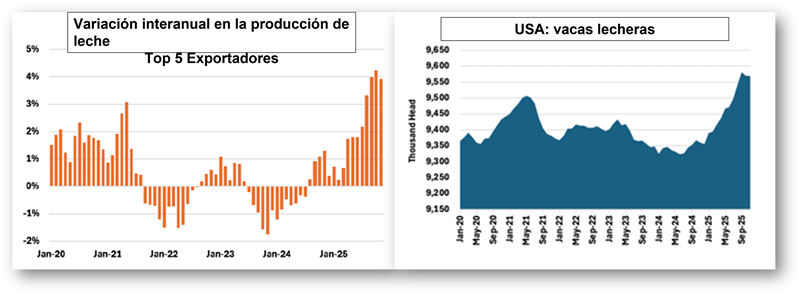 La leche continúa fluyendo a raudales en todo Estados Unidos. La producción se disparó un 4,5% interanual en noviembre, aunque, notablemente, el volumen del mes se comparó con la cifra de 2024, deflactada por el H5N1. La producción de California aumentó un drástico 10,4%, ya que el estado lechero más grande del país superó el pobre rendimiento del año pasado. Sin embargo, otros estados lecheros importantes también contribuyeron al aumento general. La producción aumentó un 5,6%, un 4,9% y un 3,2% en Idaho, Texas y Nueva York, respectivamente. El aumento de la producción nacional se debió tanto a un aumento del 2,2% en el rendimiento como a un rebaño lechero que se ha expandido en 211.000 cabezas desde la misma época del año pasado. Sin embargo, el número de vacas del rodeo disminuyó en 11.000 en octubre antes de mantenerse estable en noviembre, lo que sugiere que quizás la motivación para aumentar el rodeo se esté disipando. Si bien es impresionante, EE. UU. está lejos de ser el único lugar que muestra una trayectoria de crecimiento similar en la producción de leche. Los volúmenes están aumentando en casi todo el mundo. Si bien la demanda de lácteos ha sido mejor de lo que muchos esperaban a principios de 2025, no ha sido suficiente para absorber toda esta leche, y los precios han bajado en consecuencia.