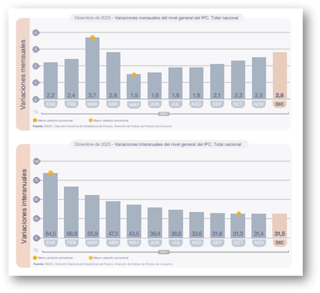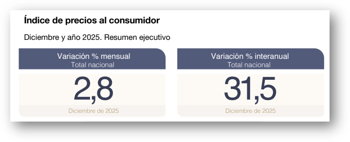 El nivel general del Índice de precios al consumidor (IPC) representativo del total de hogares del país registró en diciembre una variación de 2,8% con relación al mes anterior, en el año acumuló una suba del 31,5%.