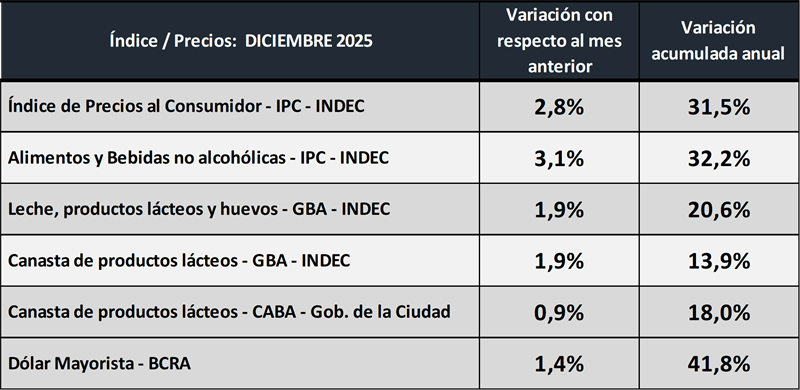 Precios de los lácteos al mes de diciembre de 2025 13/1/2026