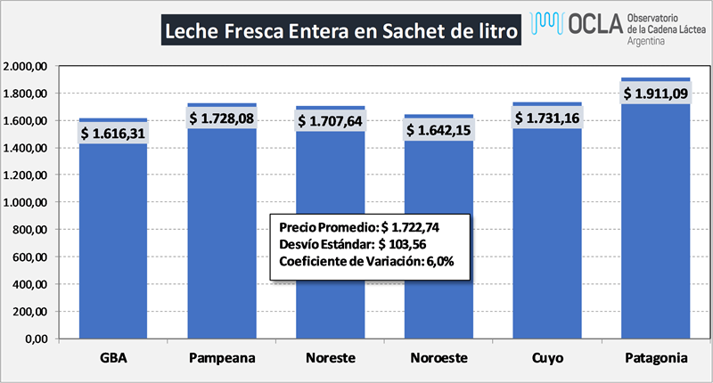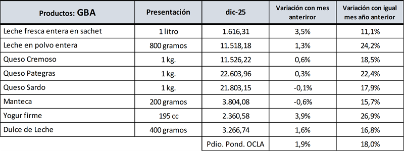 Según datos publicados por la Dirección General de Estadísticas y Censos - Ministerio de Hacienda del Gobierno de la Ciudad de Buenos Aires, los precios de los productos lácteos de esta canasta, tuvieron un crecimiento mensual promedio ponderado del 0,9%, y un incremento interanual del 13,9%. El ponderado es elaborado por OCLA sobre el mismo criterio mencionado para la canasta GBA de INDEC.