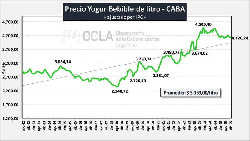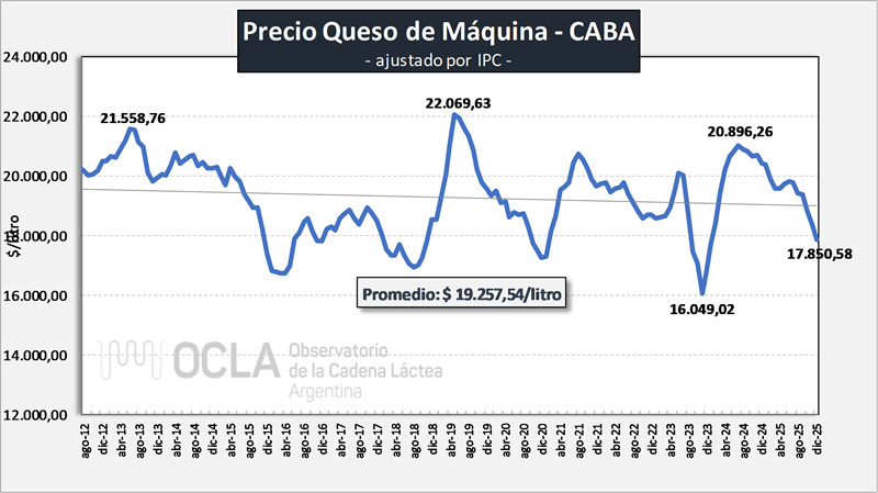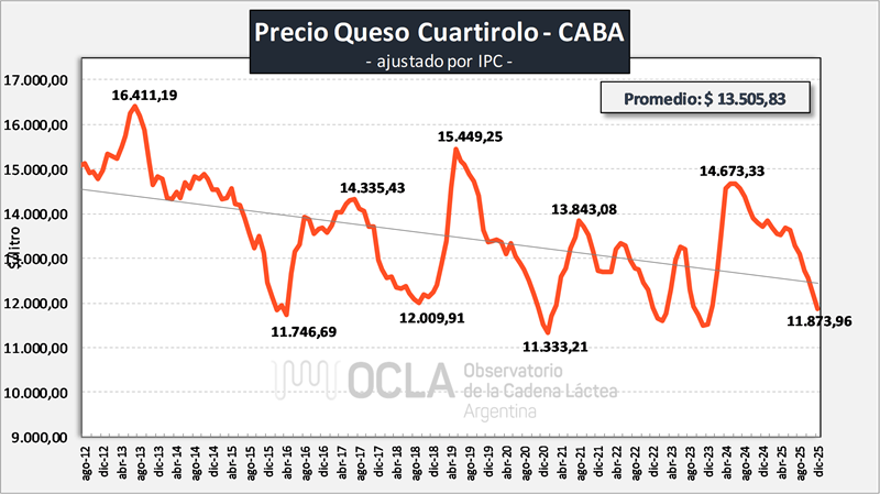 En los cuatro gráficos siguientes se toman como referencia productos básicos como la leche común entera de litro, el queso cuartirolo, el queso barra o de máquina y el yogur bebible de litro, en este caso de CABA por contar con una serie un poco más prolongada en el tiempo y se los actualiza por el índice de precios al consumidor. En la leche común entera de litro se observa que el precio de diciembre del 2025 es 1,3% superior al mes anterior en moneda corriente y un 19,0% menor al precio observado en igual mes del año anterior en moneda constante. Siguiendo en el análisis a moneda constante, el precio de diciembre de 2025 se ubica 9,1% por debajo de la media de la serie y es 27,9% más bajo que el máximo alcanzado hasta ahora en marzo de 2024, y presenta la tendencia de estos últimos 14 años como estable, a pesar de una fuerte pendiente negativa en los últimos 21 meses.