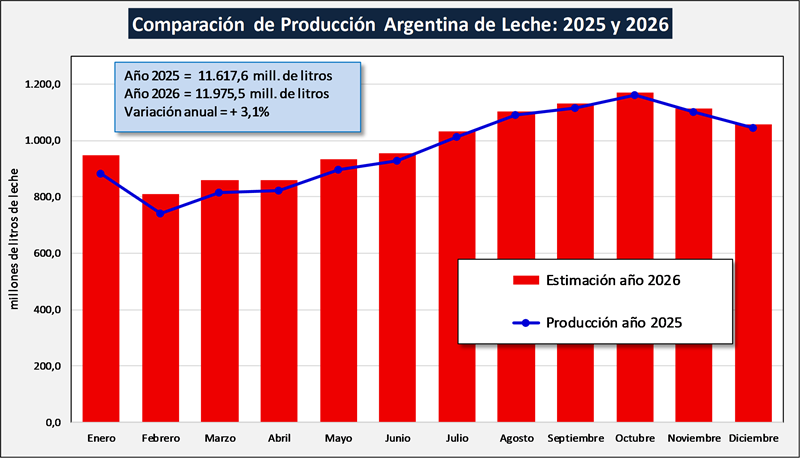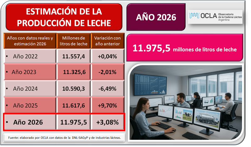 Esta estimación surge de la información aportada por 20 industrias lácteas que reciben y procesan algo más del 50% de la leche de Argentina, sin ninguna otra intervención de OCLA sobre dichos números y arrojó una estimación de suba del 3,08% anual, alcanzando la producción estimada para 2026 un volumen de 11.975,5 millones de litros de leche.