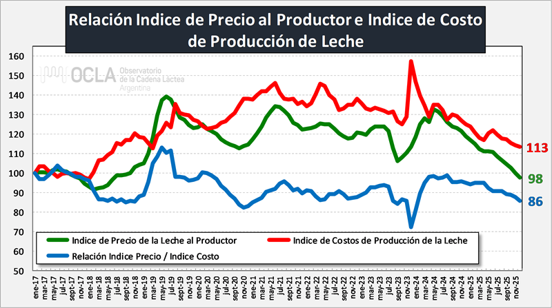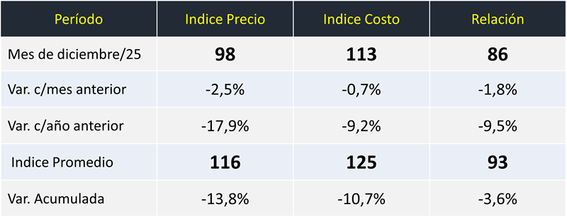 En diciembre de 2025 se cae el índice precio y el índice costo en menor magnitud, lo que hace caer, la relación a un valor 86. En la comparación interanual el precio cae 8,7 puntos porcentuales más que el costo, lo que hace que la relación entre ambos ser reduzca un 9,5%. En el acumulado del año hay una baja del 3,6% respecto a igual período del año anterior en el índice. Como ya lo indicamos en el informe de costos, los precios se vienen ajustando por debajo de la inflación, pero una situación similar venía ocurriendo con los principales costos, lo cual mantenía favorables aún las relaciones de precios. Esa situación empeora en los cuatro últimos meses y de continuar esta leve pero consecutiva desmejora de los precios respecto a los costos, las relaciones pueden comenzar a tornarse muy desfavorables. Es importante que siga recuperándose el consumo doméstico y que siga mejorando la situación de precios de exportación, sobre todo dado el crecimiento de la producción en términos interanuales.