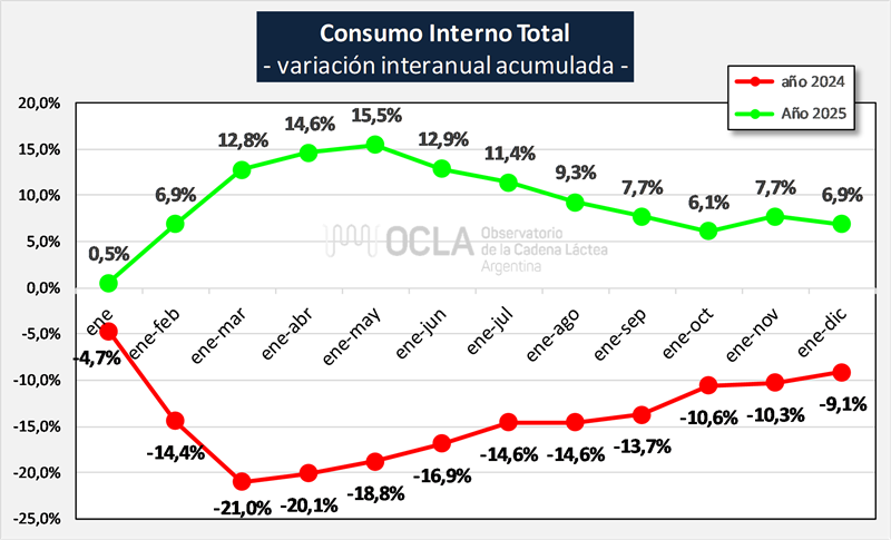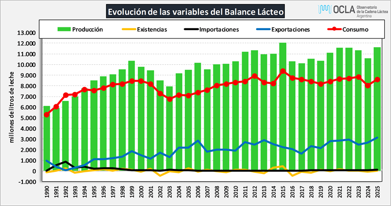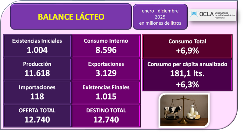 La diferencia inicial de stocks es de -56 M lts. que se contraponen con 1.027 M lts. de producción y 61 M lts. de importaciones adicionales al año anterior, genera una oferta de 1.032 M lts. superior al año pasado, de los cuales se exportaron 467 M lts. más que el año pasado y quedan en stocks 11 M lts. más, lo cual determina un consumo de 554 M lts. superior al año anterior. Por lo tanto, el crecimiento de producción de leche del año 2025 fue absorbido en un 54% por el mercado doméstico y el restante 46% se destinó a la exportación.
