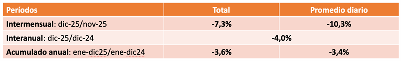 El índice en diciembre 2025 baja respecto al mes anterior el 10,3% en promedio diario, siendo que la producción bajo (-8,2%) y el precio promedio del VLE estuvo en moneda constante -2,3% por debajo al mes anterior. En la variación interanual la caída del índice fue del 4,0% y contrapone un crecimiento de la producción del 5,2% y una disminución de VLE de 8,7%.
