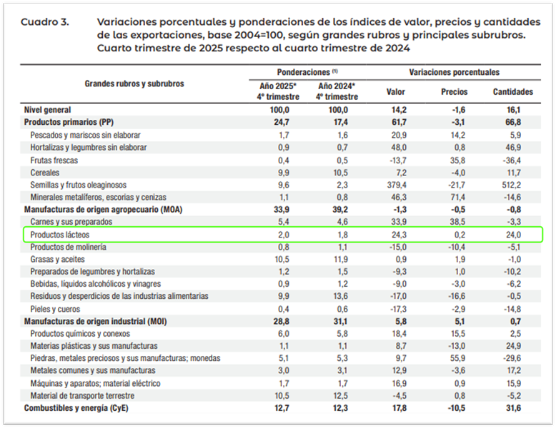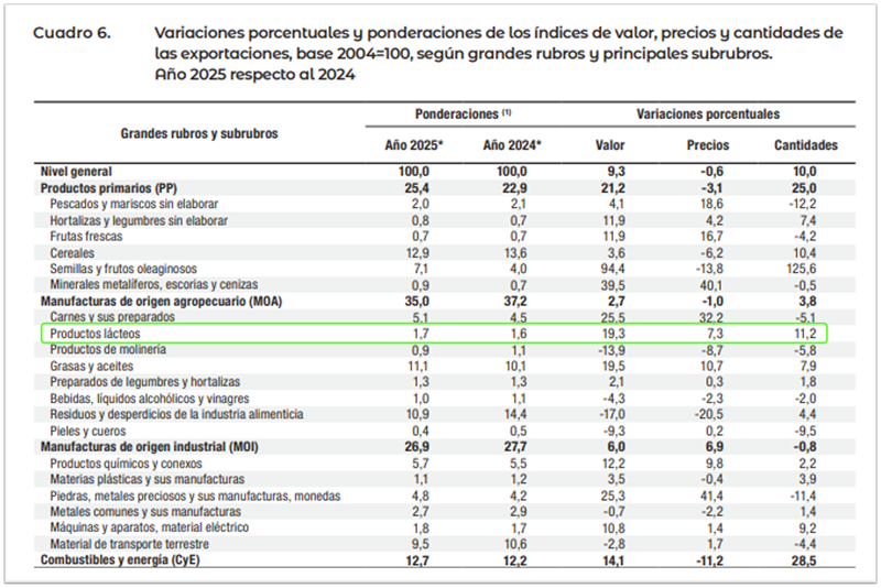 En general en el año 2025 las cantidades exportadas crecieron el 10,0% interanual, las de Productos Primarios lo hicieron el 25,0%, y las Manufacturas de Origen Agropecuario el 3,8%, dentro de las cuales están los lácteos que lo hicieron en un 11,2%.