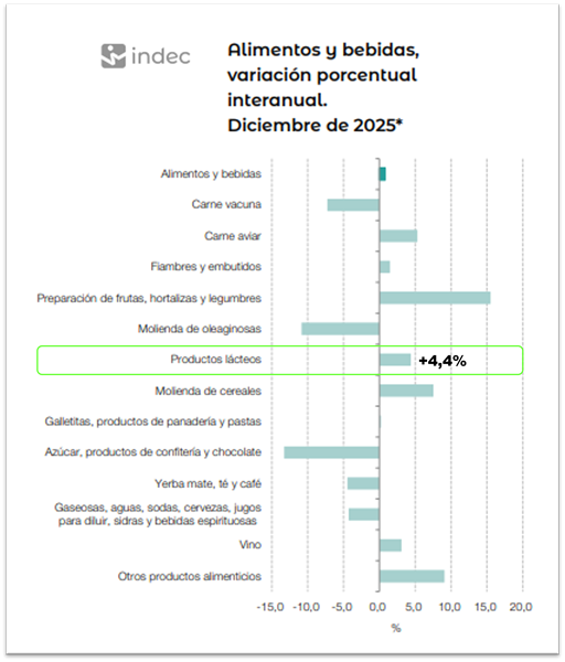 El IPI Manufacturero de los Productos Lácteos estuvo quinto entre los de mayor incremento interanual en diciembre del rubro Alimentos y Bebidas, donde algunos rubros presentaron valores negativos.