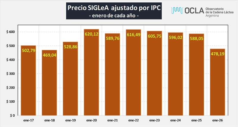 En una visión de más corto plazo el gráfico anterior muestra el precio por litro de leche actualizado a enero 2026 por inflación y que el precio de enero de 2026 es el más bajo de las series analizadas.
