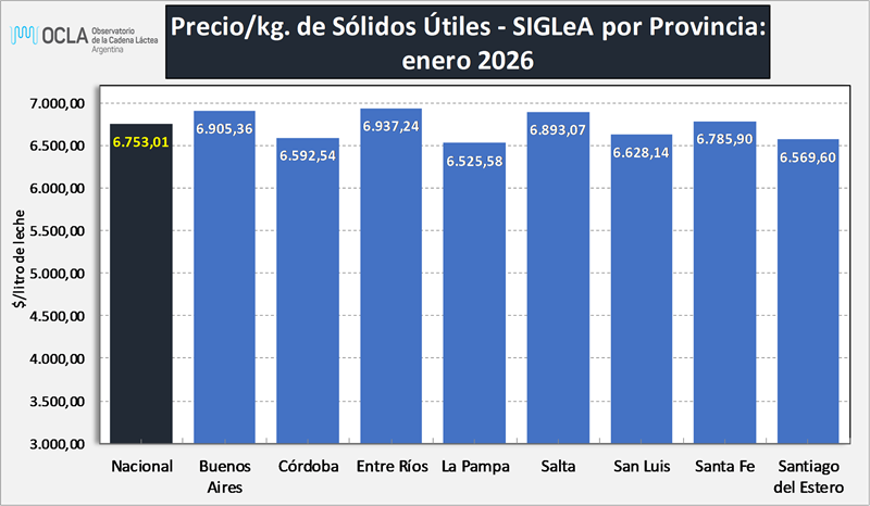 A continuación, se puede ver el Precio SIGLeA por litro de leche y por kg. de Sólidos Útiles (Grasa Butirosa + Proteína) discriminado por Provincia y por Cuenca Lechera.