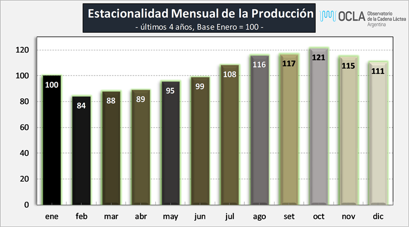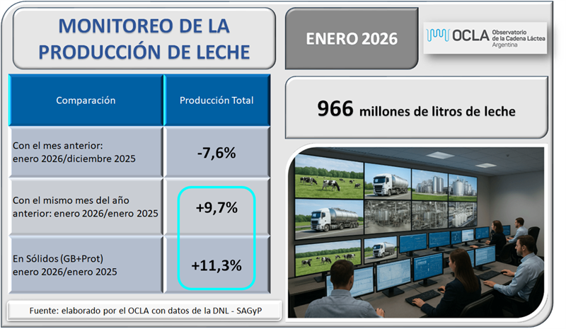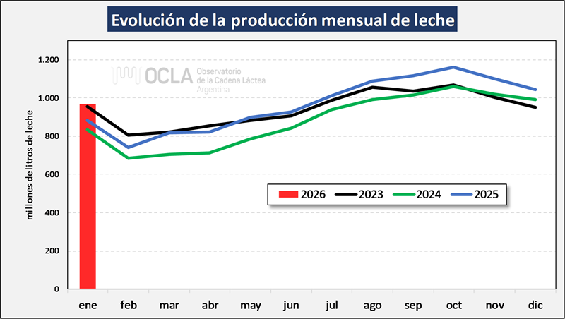 En el mes de enero del 2026 la producción fue de 966 millones de litros de leche, esto implica un valor 7,6% por debajo del mes anterior, un 9,7% más que igual mes del año anterior.
