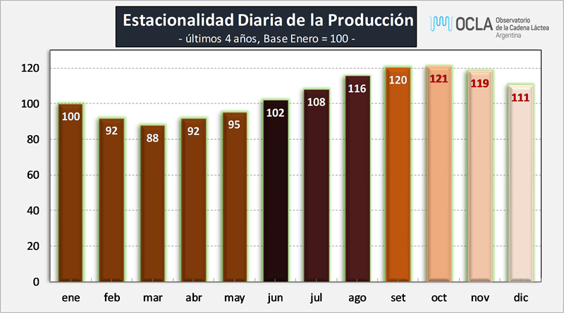 Como es habitual, la producción desde el pico de máxima en octubre, cae a una tasa del 5 al 6% mensual hasta marzo/abril (tomando el promedio diario de producción, para que no afecten la cantidad de días de cada mes), donde luego comienza un nuevo repunte hacia octubre.