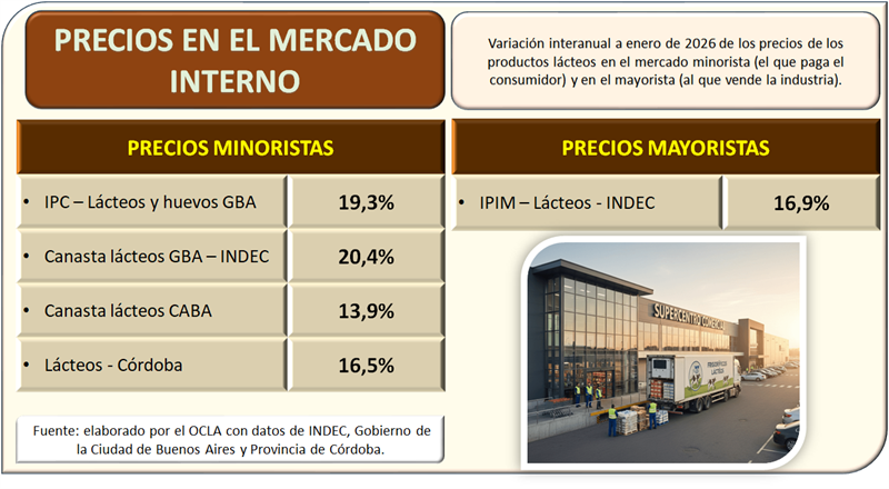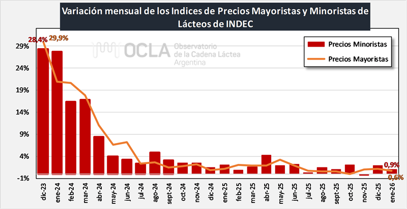 El índice mayorista de precios de los Lácteos registró un aumento de 0,6% en enero de 2026 respecto del mes anterior, y se incrementó en el interanual un 16,9%.