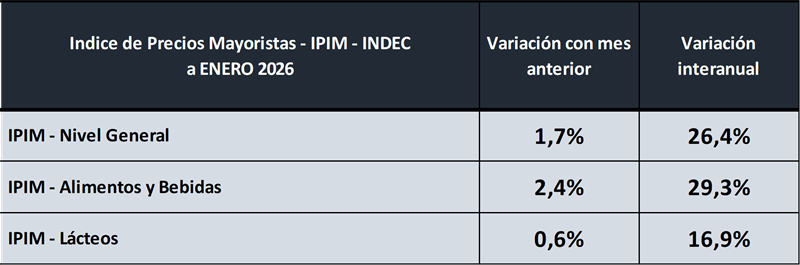 Índice de Precios Internos Mayoristas – IPIM – Lácteos – enero 2026 19/2/2026